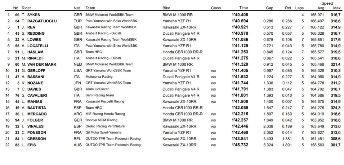 A la surprise générale, l’Anglais a réussi à se maintenir en tête de la hiérarchie, et ce en dépit des améliorations de dernière minute de Razgatlioglu et Rea, qui se sont succédés brièvement à la première place. Mais ces derniers n’ont cependant rien pu faire contre Sykes, auteur de la 51e Superpole de sa carrière, la dernière remontant à Philipp Island l’an passé à l’issue d’un dernier tour d’anthologie.
