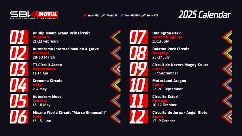 Le calendrier provisoire du Championnat MOTUL FIM World Superbike 2025 a été dévoilé avec 12 manches, et présente quelques petites nouveautés par rapport aux saisons passées: Portimao et Most ont été avancés, tandis que le Balaton Park devrait faire ses débuts en WorldSBK en juillet.