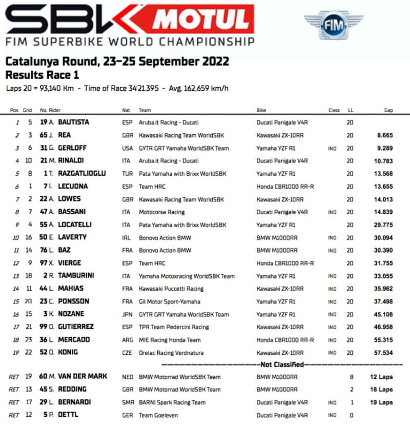 Dans la course d’ouverture du weekend WorldSBK à Catalunya-Barcelona, Álvaro Bautista a été inaccessible mais Jonathan Rea est revenu de la septième place dans les premiers tours à la deuxième place au drapeau à damier. Un long moment dans le sillage de la Ducati victorieuse, Toprak Razgatlioğlu a dû rétrograder à la 5e position après avoir détérioré son pneu arrière.