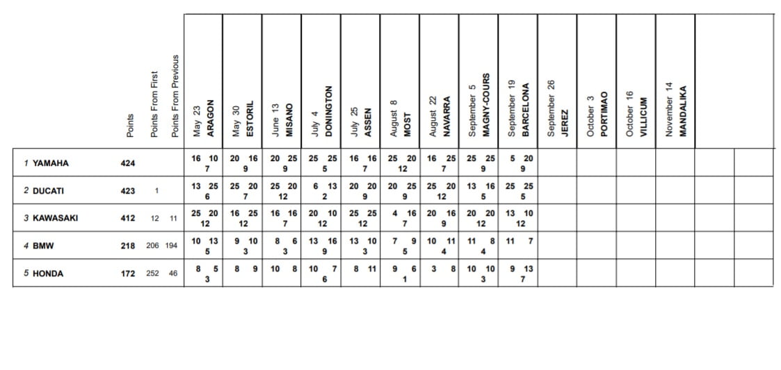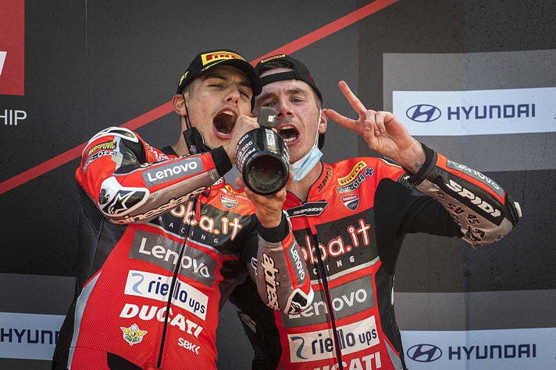 Au classement des constructeurs, Yamaha préserve la tête mais voit son avance réduite à seulement six points sur Ducati, qui a repris la place de dauphin à Kawasaki ce weekend au gré de ses deux victoires et notamment d’un triplé lors de la Course 1 (le premier pour le constructeur de Borgo Panigale depuis 2012), lorsque Redding a signé son sixième succès de la saison, devant Axel Bassani (pour qui il s’agissait du premier podium dans la catégorie) et son coéquipier Rinaldi.
