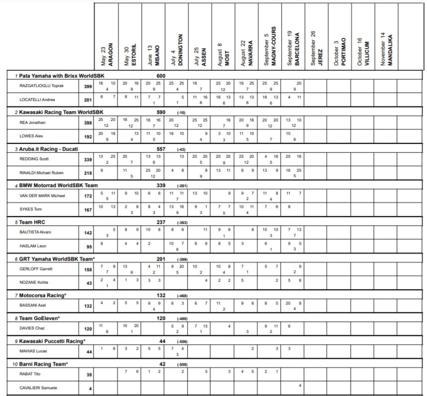 Rinaldi passe ainsi devant Andrea Locatelli (dont le contrat a été prolongé jusqu’à fin 2023 avec Yamaha) et Alex Lowes (qui a été victime d’une contusion au poignet à l’issue de la Course 2), alors que derrière eux Michael van der Mark prend l’ascendant sur Tom Sykes chez BMW, profitant des misères du Britannique ce weekend pour pointer à la septième place.