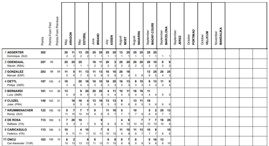 Las pour le Sud-Africain, celui-ci n’a pas saisi la balle au bond, ne grappillant que 17 points sur son adversaire. 45 unités séparent donc encore les deux hommes, alors que Aegerter fera son retour lors de la prochaine manche, en fin de semaine à Jerez. Randy Krummenacher a profité de l’aubaine pour retrouver le chemin de la victoire lors de la Course 1, avant que Manuel González ne l’imite lors de la seconde épreuve de la catégorie dimanche.