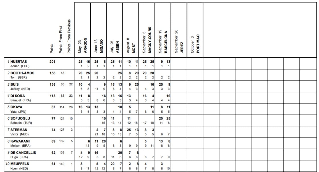 La prochaine manche aura donc lieu dès cette fin de semaine, de nouveau en Espagne, en Andalousie sur le circuit de Jerez. A noter que seul Huertas en Supersport 300 se trouvera d’ores et déjà en position de coiffer la couronne dans sa catégorie sur ce rendez-vous.