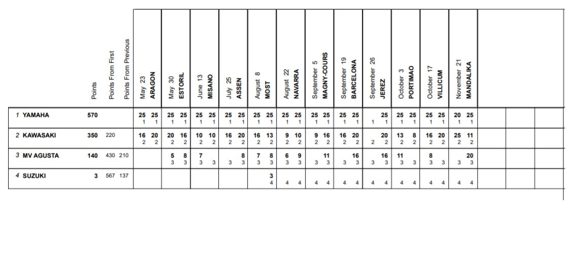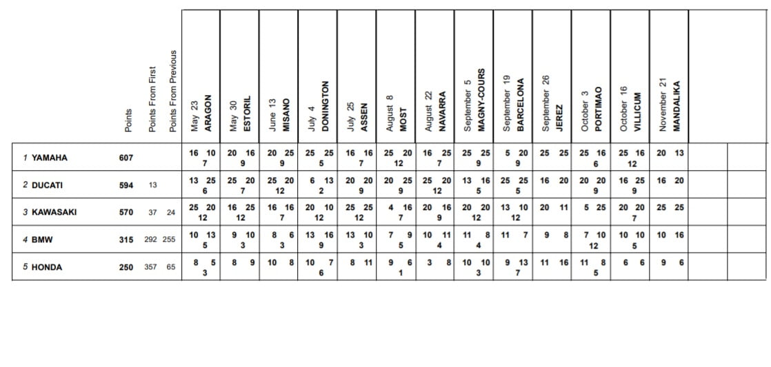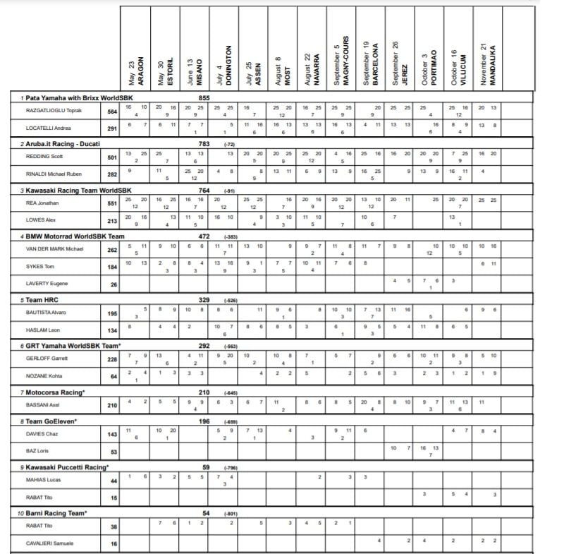 Chez les constructeurs, Yamaha a réussi à avoir le dernier mot face à Ducati. La marque aux trois diapasons termine ainsi avec 13 points d’avance face à la structure de Borgo Panigale, alors que Kawasaki doit se contenter de la troisième place, devant BMW et Honda.