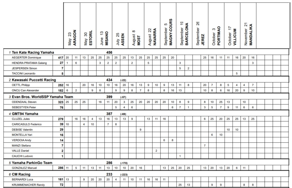 Chez les constructeurs, Yamaha rafle le titre assez facilement en ayant remporté 22 des 23 courses disputées en 2021. La seule épreuve ayant échappé à la marque d’Iwata est en fait la Course 1 remportée par De Rosa à Mandalika samedi, l’Italien évoluant sur Kawasaki.
