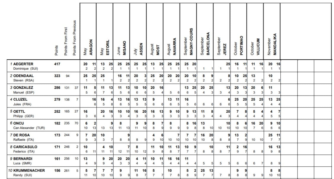 Avec une telle dynamique lors des dernières manches, il fait peu de doutes que le tricolore visera l’an prochain un titre qui s’est toujours refusé à lui jusqu’ici dans la catégorie. L’Auvergnat boucle ainsi sa saison à sept points seulement de Manuel González, qui est devenu le plus jeune poleman et vainqueur dans la catégorie cette saison, et qui rejoindra le Moto2 l’an prochain.