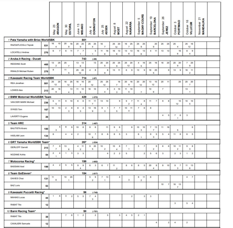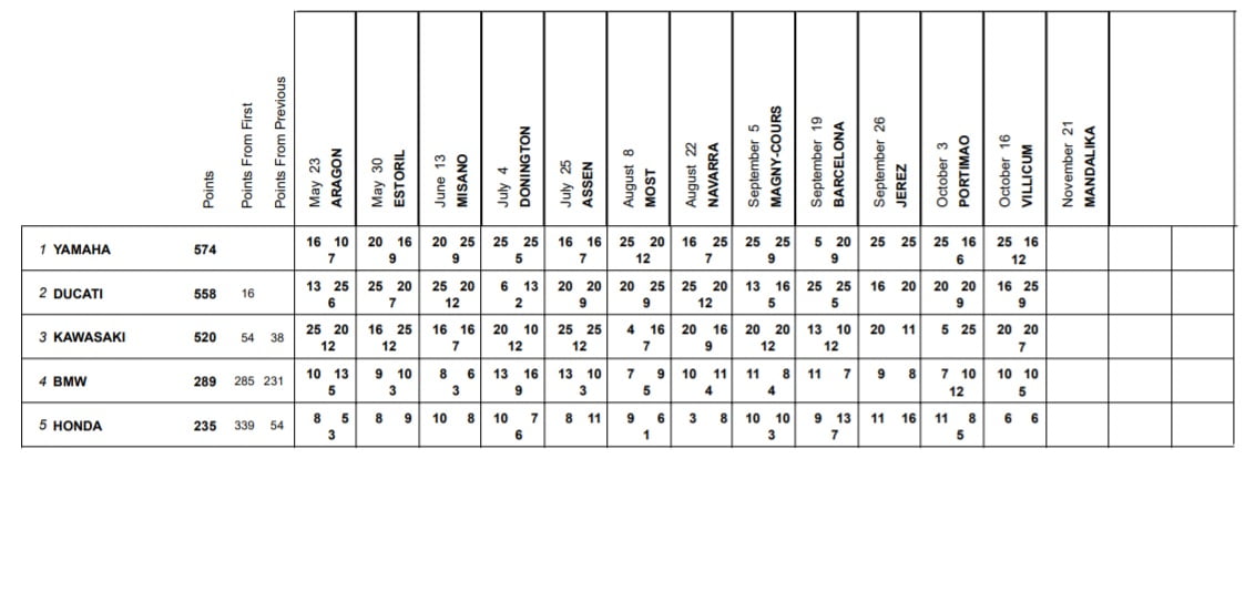 Chez les constructeurs, Yamaha reste en tête avec une légère avance sur Ducati, qui semble être en mesure de donner le change à la marque aux trois diapasons jusqu’à la fin de la saison. Le titre devrait d’ailleurs se jouer entre les deux entités, Kawasaki se trouvant à présent distancée, à 38 points du constructeur italien et à 54 points du constructeur japonais.