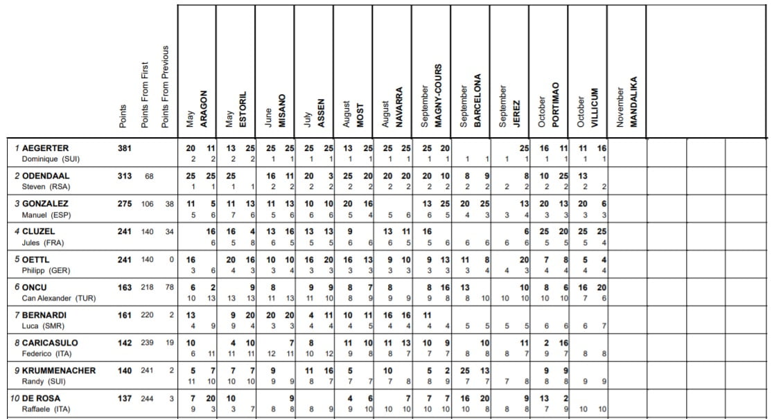 Le Néerlandais devance ainsi Alex Lowes et Garrett Gerloff. L’Américain a réalisé une prestation d’ensemble de bonne facture ce weekend, revenant ainsi à hauteur de l’Anglais, mais devra tout de même prendre garde lors de la dernière manche à Axel Bassani, qui le menace plus que jamais pour le titre de meilleur pilote indépendant cette saison.
