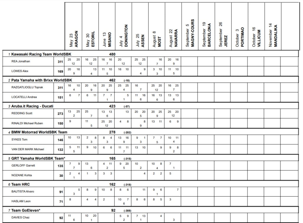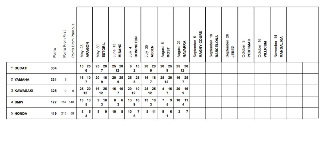 Si les jeux sont donc loin d’être faits au championnat des pilotes, il en est de même chez les constructeurs : Neuf points seulement séparent Ducati (334 points), nouveau leader, de Kawasaki (325 points), Yamaha se trouvant à mi-chemin (331 points). Chez les équipes en revanche le Kawasaki Racing Team préserve sa première position, mais voit l’équipe Pata Yamaha revenir à quelques enjambées, l’écart les séparant étant passé de 27 à 18 unités.