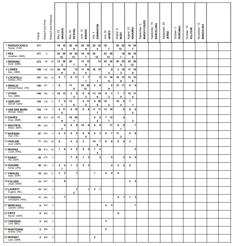 Il devance ainsi à présent son compatriote Michael Ruben Rinaldi pour un petit point seulement, alors que suivent ensuite Tom Sykes et Garrett Gerloff, ce dernier qui effectue le chemin inverse au classement en chutant du sixième au huitième rang. Pour le reste, les positions sont inchangées à partir de la neuvième place.