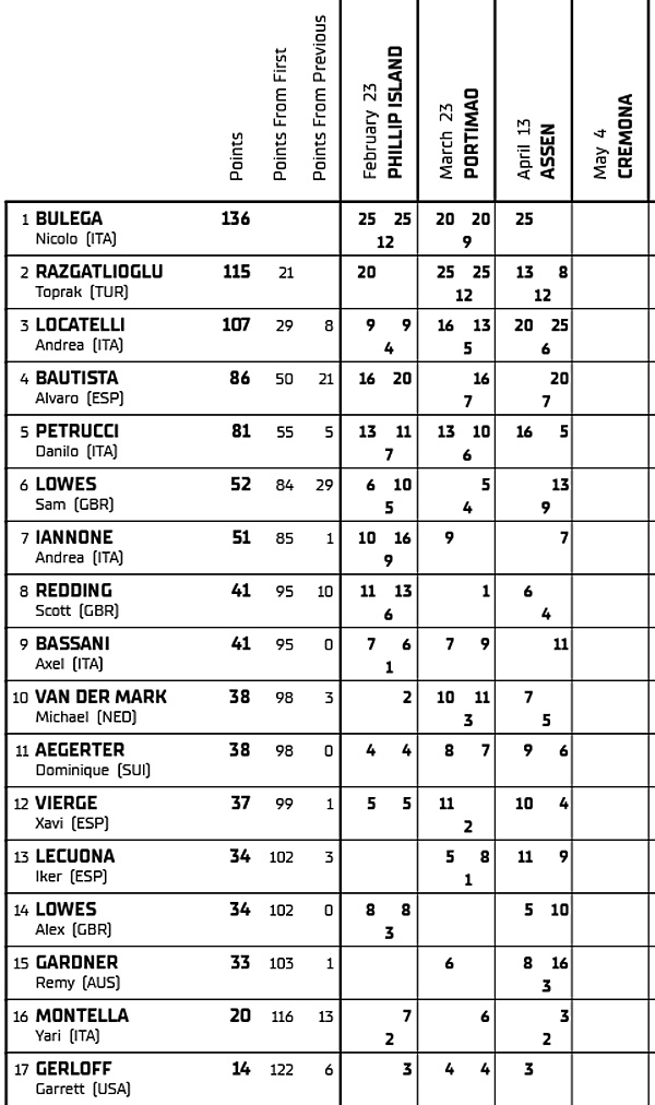Avec 62 points en jeu ce week-end, ces 5 pilotes pourraient théoriquement quitter l’Italie en tête du championnat, ce qui n’est pas le cas de Sam Lowes (Marc VDS Ducati), 6e avec un déficit de 84 unités.