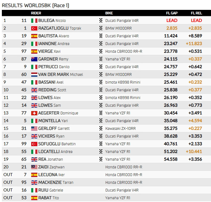Ducati remporte le premier défi avec un Nicolo Bulega parfait, le Turc Toprak Razgatlioglu n’a tenu que cinq tours. Alvaro Bautista monte sur la 3e marche, Andrea Iannone s’est bien battu mais le podium lui échappe.