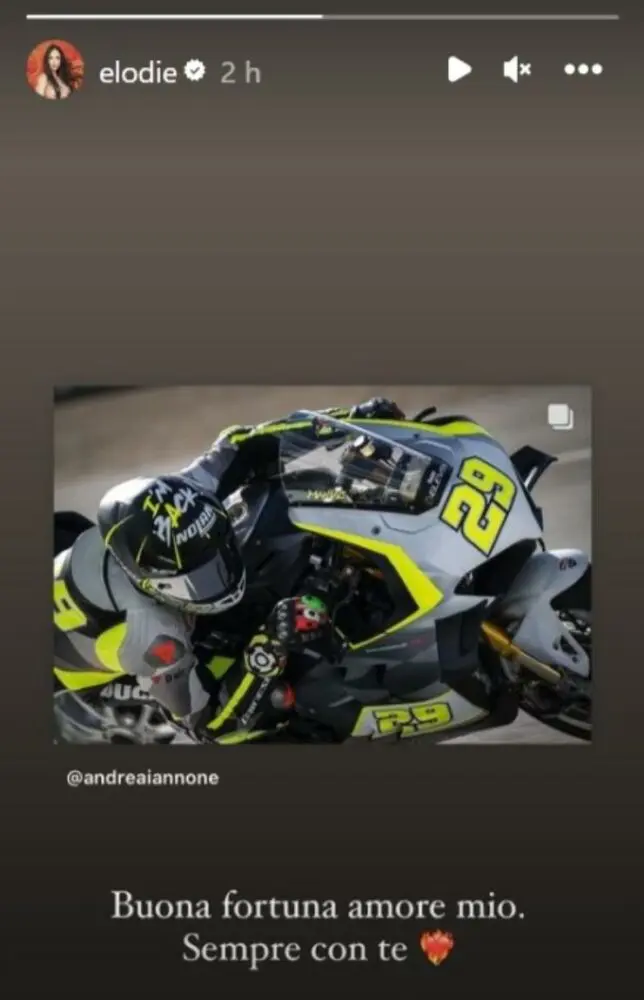 On ne pouvait pas manquer celui de sa compagne Elodie, qui a également partagé la publication dans l’une de ses stories Instagram en écrivant : « Bonne chance mon amour, toujours avec toi“. La célèbre chanteuse l’a beaucoup soutenu depuis qu’ils sont devenus un couple permanent et ne manquera certainement pas sa présence à certaines épreuves du calendrier SBK.