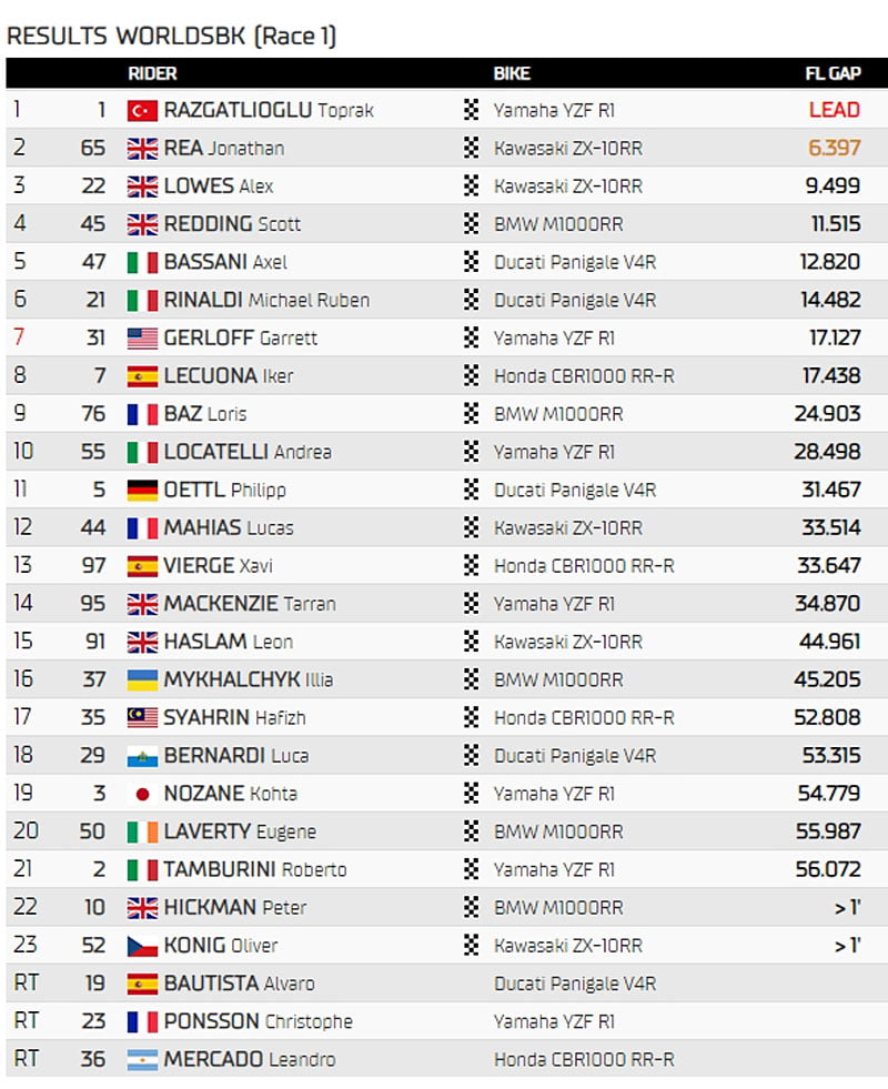 Toprak leads at the end of lap 1 ahead of Bautista, Lowes, Lecuona and Rea!#GBRWorldSBK 🇬🇧 pic.twitter.com/t3YtAMPZjC