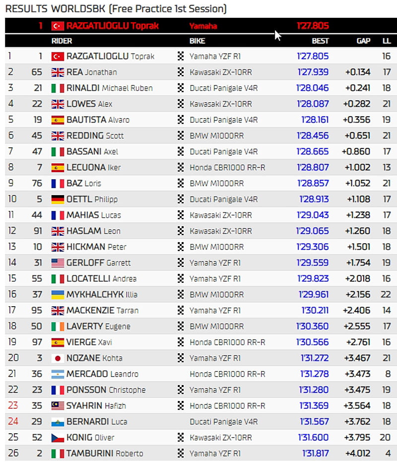 Jonathan Rea ressort alors en piste mais l’attaque vient finalement de Toprak Razgatlioglu qui réalise in extremis le meilleur temps en 1’27.805 !