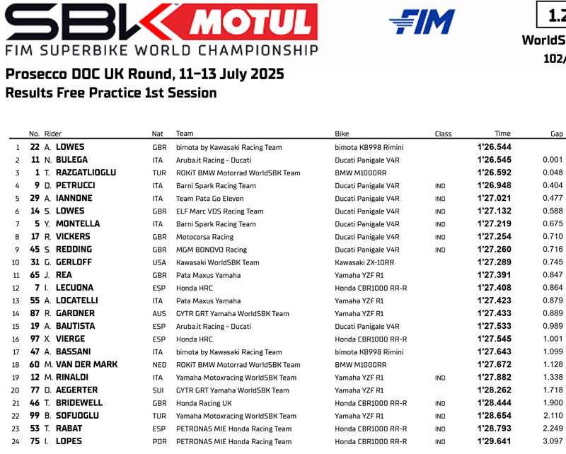 Le soleil tape fort sur le circuit britannique, et les températures inhabituellement élevées ont quelque peu affecté les performances, bien loin de celles de l’an dernier. Alex Lowes est incroyablement rapide ici ; l’an dernier, lors de la première course, il avait terminé deuxième sur la Kawasaki, derrière l’invincible Toprak Razgatlioglu. Mais ce n’est évidemment qu’un début, et il y a fort à parier que le Turc et Nicolò Bulega brilleront tous deux cet après-midi.