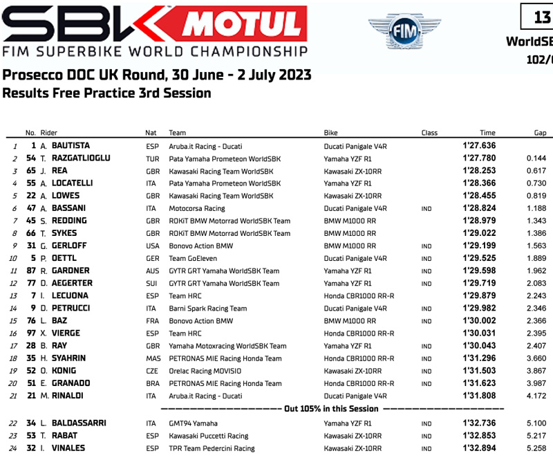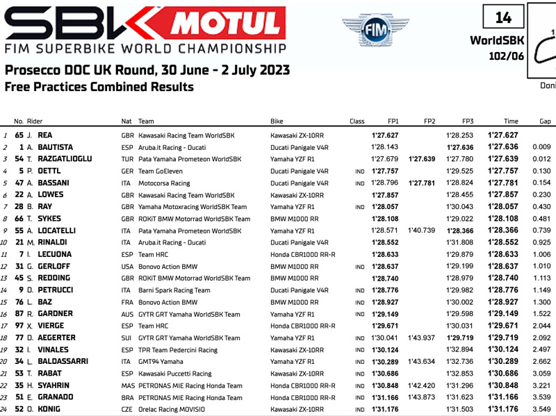 Résultats combinés FP1-FP2-FP3 des Superbike à Donington Park :