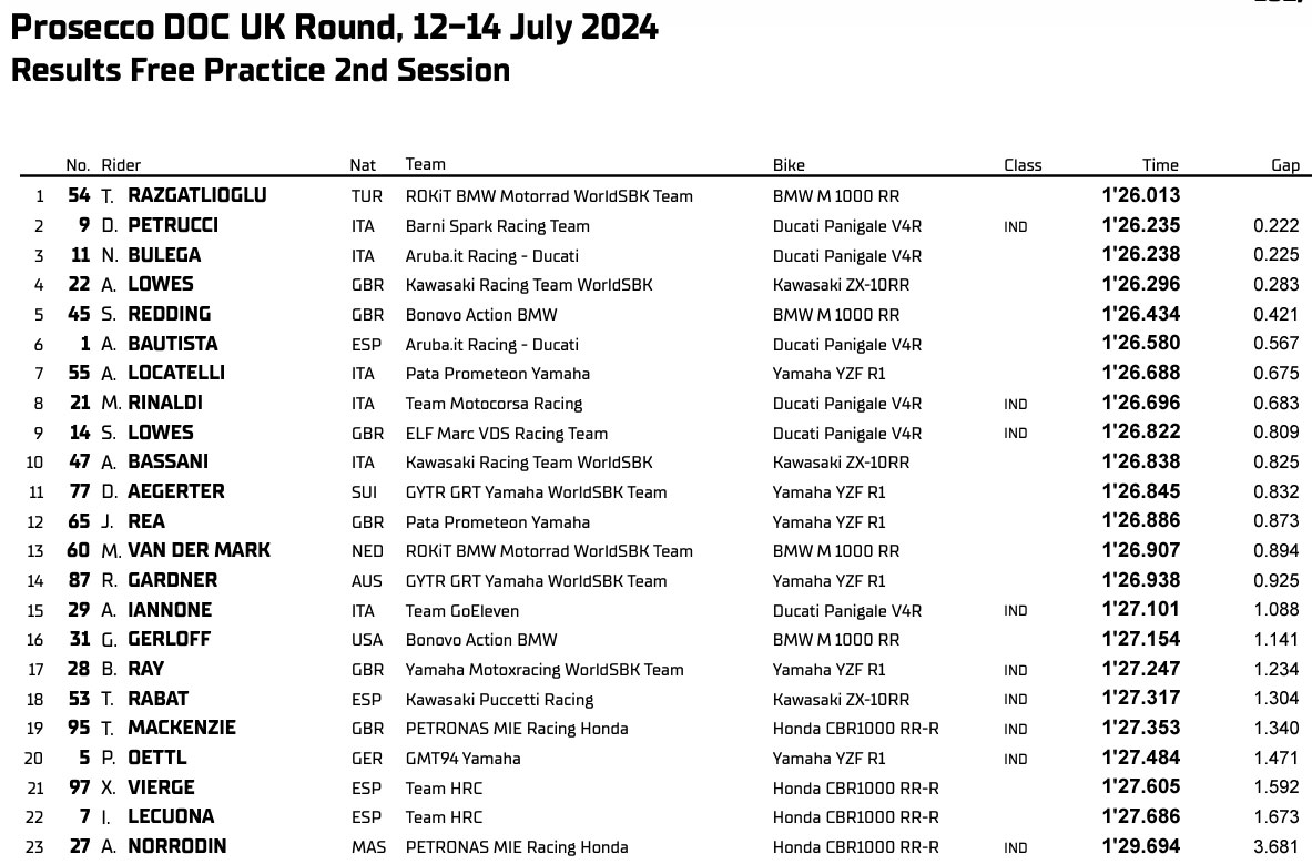 Alex Lowes (Kawasaki Racing Team WorldSBK) a été le meilleur pilote britannique lors de la course à domicile. Le pilote Kawasaki a terminé la journée avec 0,283 seconde de retard sur Razgatlioglu.