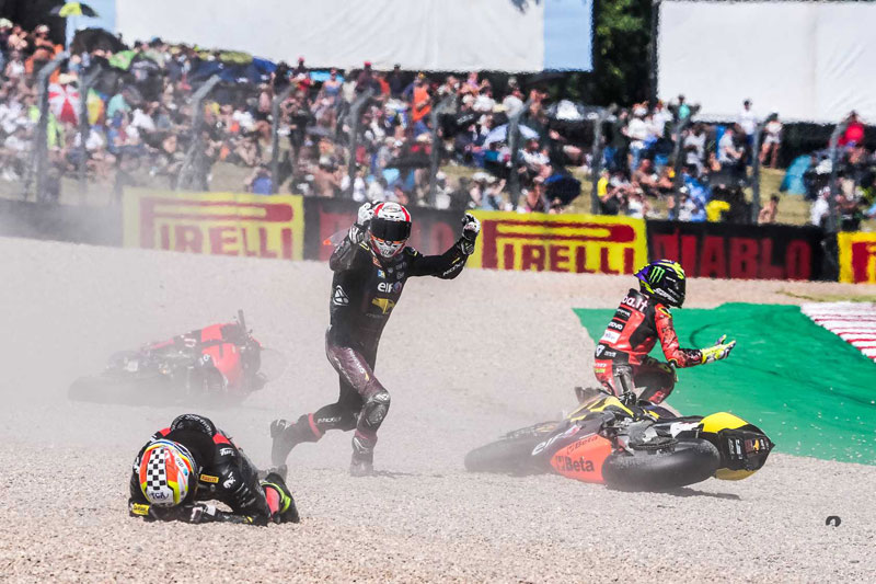 Le premier tour a été marqué par un incident dans le virage 1, où Yari Montella est entré en contact avec Sam Lowes, impliquant également Alvaro Bautista. Le trio a immédiatement été contraint à l’abandon.