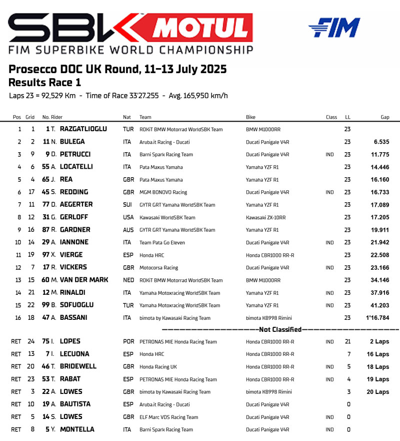 Razgatlioglu se rapproche à quatre points de Bulega, tandis que Petrucci porte son avance sur Bautista à 23 points.
