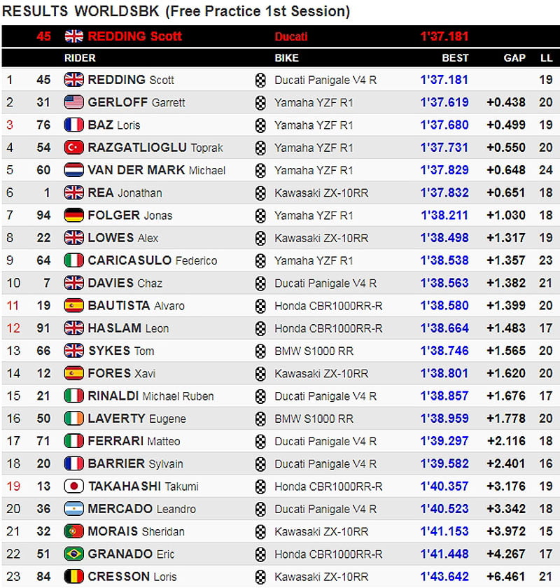 Il y a quatre Yamaha dans les sept premières positions: la R1 s’adapte évidemment bien à cette piste. Gerloff est allé plus vite que les officiels, Toprak Razgatlioglu et Michael van der Mark. La formation est complétée par Jonas Folger, qui, à sa deuxième sortie en Championnat du Monde, gagne des positions avec la Yamaha officielle, confiée à la direction de l’équipe MGM avec laquelle l’ancienne équipe MotoGP a remporté les douze courses de l’IDM, le Superbike allemand. Seulement le quinzième temps pour Michael Rinaldi, récemment annoncé en remplacement de Chaz Davis chez Aruba.it Ducati pour 2021.