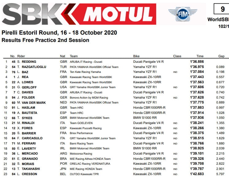 Scott Redding excelle également en FP2 mais Jonathan Rea se ressaisit : Quatrième temps. Les Yamaha très rapides avec Toprak et Baz. Michael Rinaldi progresse lentement.