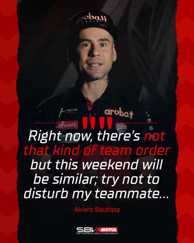 Alvaro Bautista (Aruba.it Racing – Ducati) : « En ce moment, il n’y a pas ce genre d’ordre au sein de l’équipe, mais ce week-end sera similaire ; essayez de ne pas déranger mon coéquipier… »