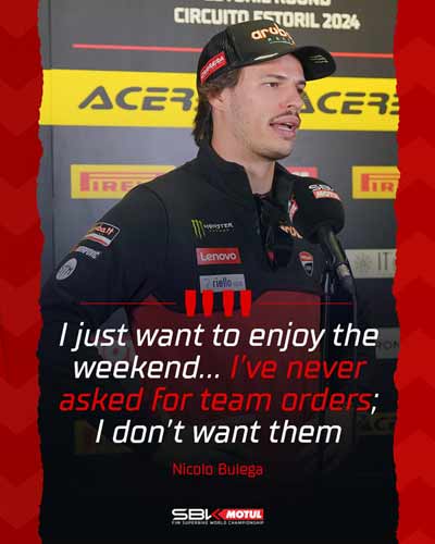 En ce qui concerne ses objectifs pour le week-end et la question de savoir s’il y a eu de nouvelles réunions d’équipe pour Estoril, Bulega a déclaré : » Je n’ai pas d’objectif pour ce week-end. Je veux juste en profiter, essayer de faire de mon mieux et c’est tout. Je n’ai jamais demandé de consignes d’équipe et je n’en veux pas. Alvaro est très rapide. S’il a la possibilité de gagner, il doit le faire. Nous faisons partie de cette équipe et de Ducati, donc je pense qu’il est important pour eux de gagner ces titres. Alvaro et moi faisons du bon travail. «