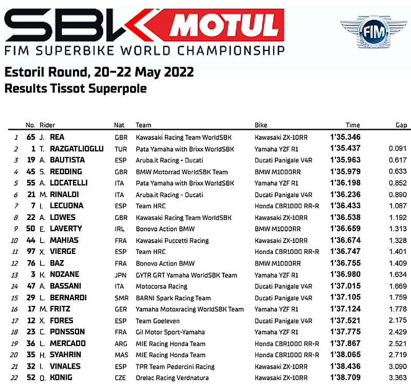 Incroyable Jonathan Rea : à Estoril, il détruit le record absolu et revient en Superpole après huit mois. A ses côtés Razgatlioğlu, Bautista et BMW montent avec Scott Redding.
