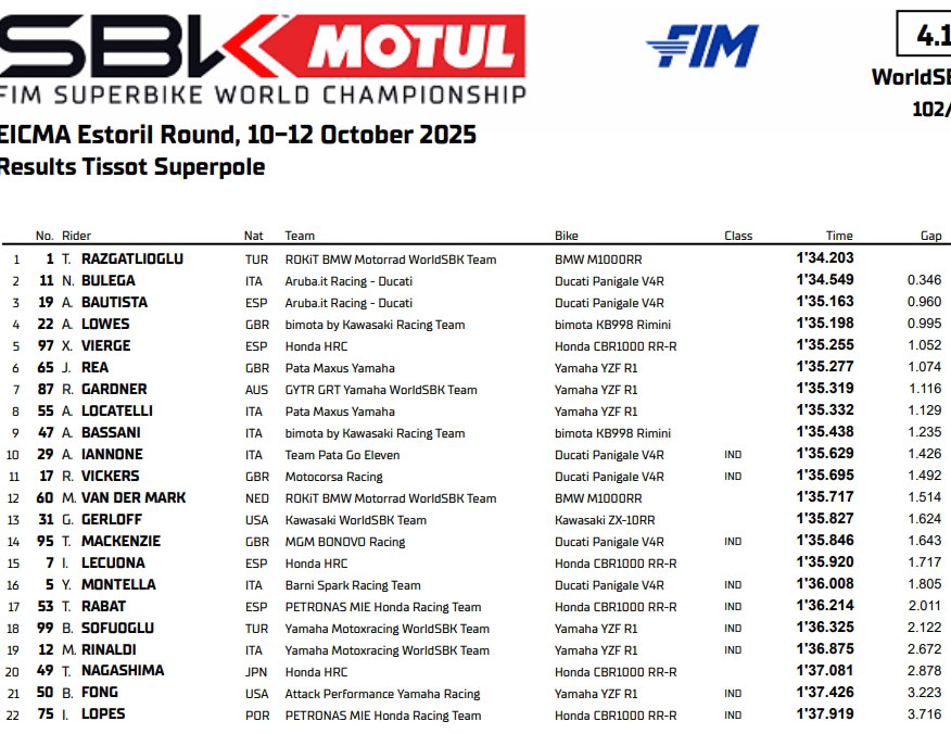 En attendant, le phénoménal Turc de BMW a décroché la 24e Superpole de sa carrière. C’est la sixième cette année, donc rien de nouveau. Mais c’est un coup dur pour Ducati. Toprak a en effet une nouvelle fois pulvérisé le record du circuit, dès le premier tour lancé ! Au final, il est descendu encore plus bas : 1’34.203. Nicolo Bulega a encaissé trois dixièmes : comment renverser la situation ? Nous verrons si l’Italien trouvera une ouverture dans la course 1 qui débutera à 15 heures.