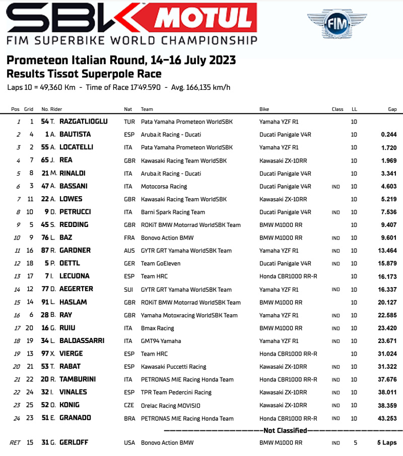 Résultats de la Course Superpole des Superbike à Imola :