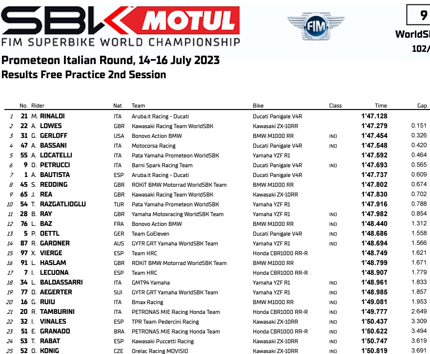 Le Top 10 est alors constitué de Axel Bassani, Jonathan Rea, Danilo Petrucci, Toprak Razgatlioğlu, Andrea Locatelli, Álvaro Bautista, Alex Lowes, Bradley Ray (Yamaha Motoxracing WorldSBK Team) et Leon Haslam qui ne s’en sort pas si mal…