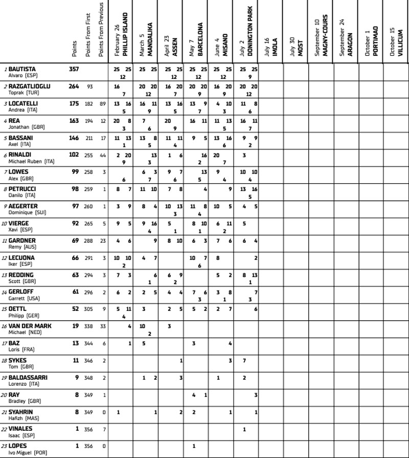 Au championnat, Álvaro Bautista (Aruba.it Racing – Ducati) y arrive en solide leader du classement général avec 93 points d’avance sur Toprak Razgatlioğlu (Pata Yamaha Prometeon WorldSBK), 182 sur Andrea Locatelli (Pata Yamaha Prometeon WorldSBK) et 194 sur Jonathan Rea (Kawasaki Racing Team WorldSBK).