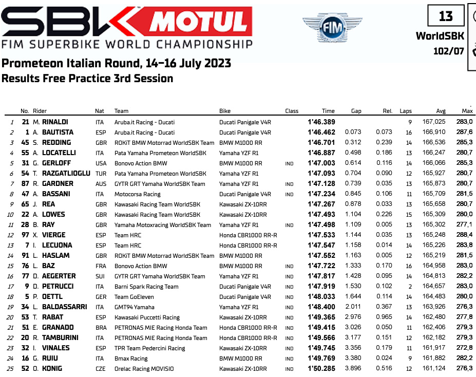 Même si curieusement les trois ténors que sont Álvaro Bautista, Toprak Razgatlioğlu et Jonathan Rea sont les seuls pilotes à ne pas avoir amélioré leurs chronos durant l’après-midi, la performance de Michael Rinaldi est d’autant plus méritante que le pilote italien n’est toujours pas pleinement remis du grave accident subi à Donington.