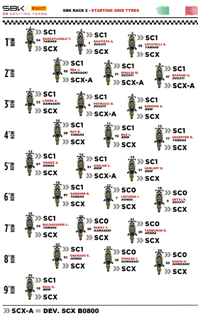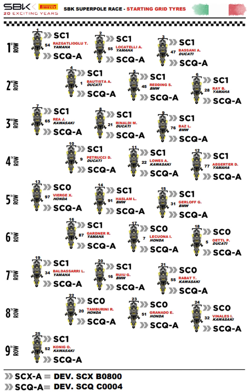 • Dans la course Superpole, le choix des pilotes a été unanime pour le pneu arrière : tous ont utilisé la nouvelle solution de développement extra tendre SCQ en spécification C0004 qui a garanti d’excellentes performances sur les 10 tours de la course. A l’avant, c’est le SC1 standard qui a remporté le plus de suffrages, mais certains pilotes de l’arrière-garde ont également utilisé le SC0. La température de l’asphalte avoisinait déjà les 50°C. Après s’être élancé de la deuxième place sur la grille de départ, Andrea Locatelli (Pata Yamaha Prometeon WorldSBK) a pris la tête de la course et l’a conservée jusqu’à la mi-course. Au cinquième tour, Álvaro Bautista (Aruba.it Racing – Ducati) dépasse d’abord Toprak Razgatlioğlu (Pata Yamaha Prometeon WorldSBK), qui avait rétrogradé de la pole position à la deuxième place, puis Andrea Locatelli, prenant provisoirement la tête de la course. Cependant, dans l’avant-dernier tour, le pilote turc de Yamaha le dépasse dans la Piratella et termine alors premier devant Álvaro Bautista, deuxième, et Andrea Locatelli, troisième.