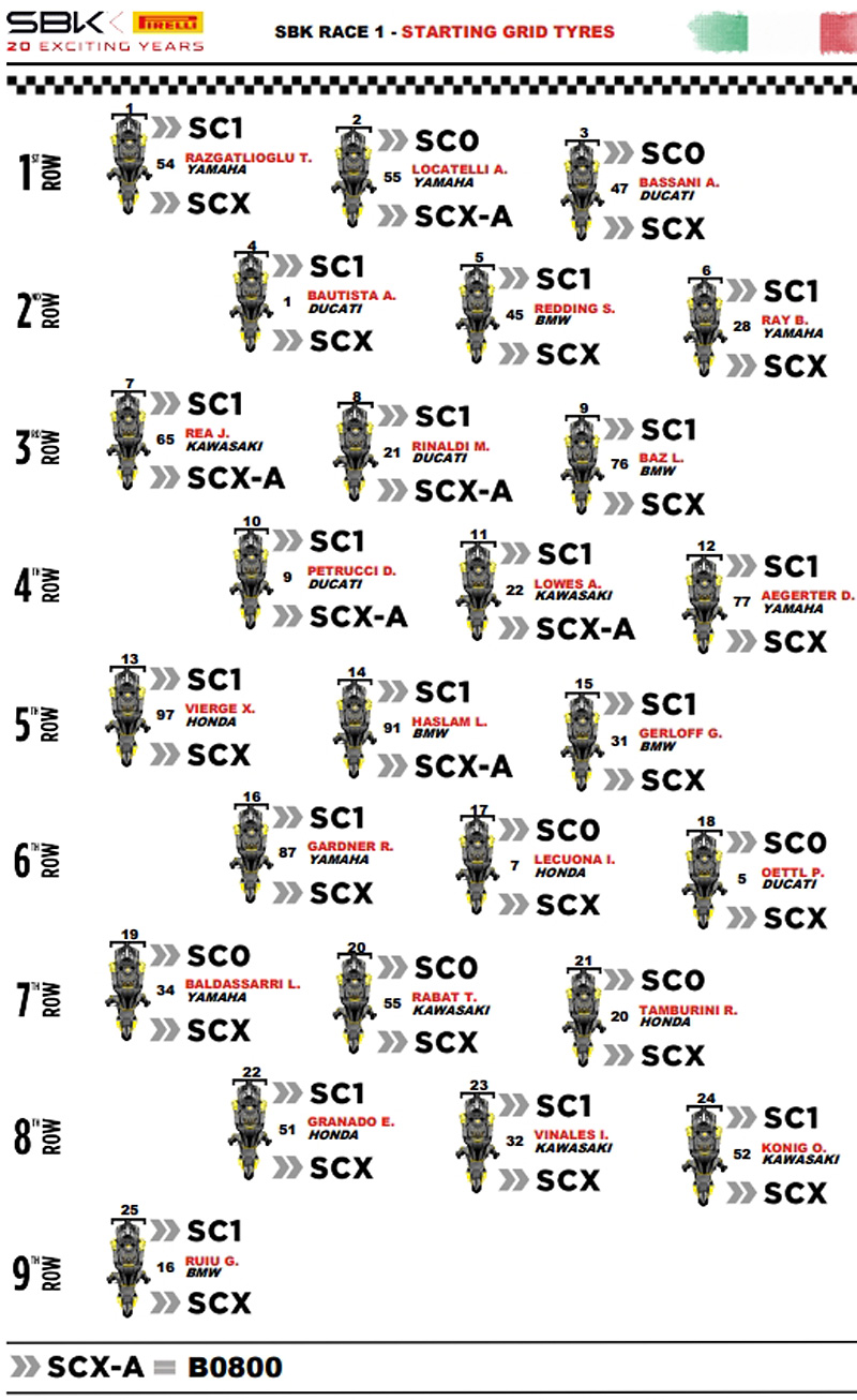 • Troisième pole position de l’année pour Toprak Razgatlioğlu (Pata Yamaha Prometeon WorldSBK) après celles obtenues lors des deux premières courses de la saison en Australie et en Indonésie. Le pilote Yamaha a pris la première place sur la grille de départ avec un temps de 1’45.959. La deuxième place est revenue à son coéquipier Andrea Locatelli, tandis que le champion du monde en titre Álvaro Bautista (Aruba.It Racing – Ducati) complétait la première ligne. Tous les pilotes ont utilisé le nouveau pneu arrière extra tendre SCQ (spécifications C0004) pour se qualifier, avec des températures d’asphalte proches de 50°C.