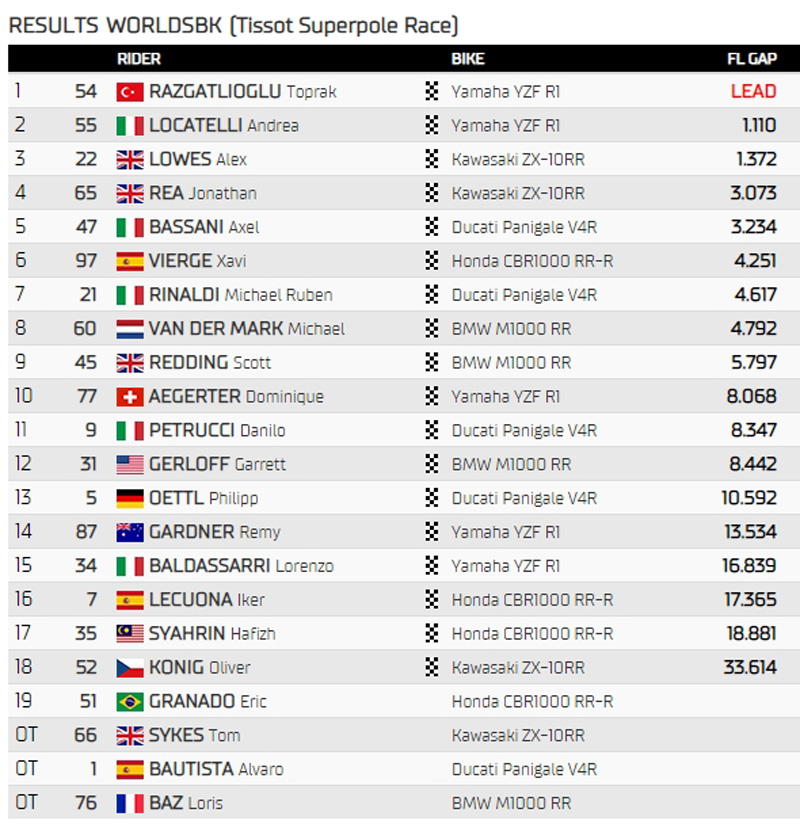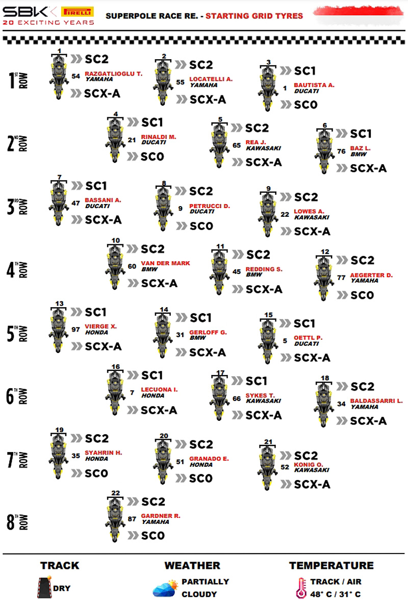 • Après s’être élancé de la pole position, Toprak Razgatlioğlu (Pata Yamaha Prometeon WorldSBK) a remporté la Superpole Race sur la distance de 8 tours après un drapeau rouge en utilisant un pneu avant SC2 standard et un SCX-A (B0800) arrière. Ce dernier avait déjà été utilisé par Álvaro Bautista (Aruba.It Racing – Ducati) pour remporter la Course 1 hier. Les mêmes pneus ont été choisis par les pilotes terminant derrière le Turc : Dans l’ordre, son coéquipier Andrea Locatelli et les pilotes Kawasaki Alex Lowes et Jonathan Rea (Kawasaki Racing Team WorldSBK).