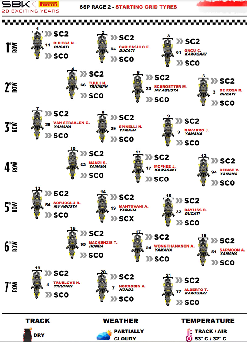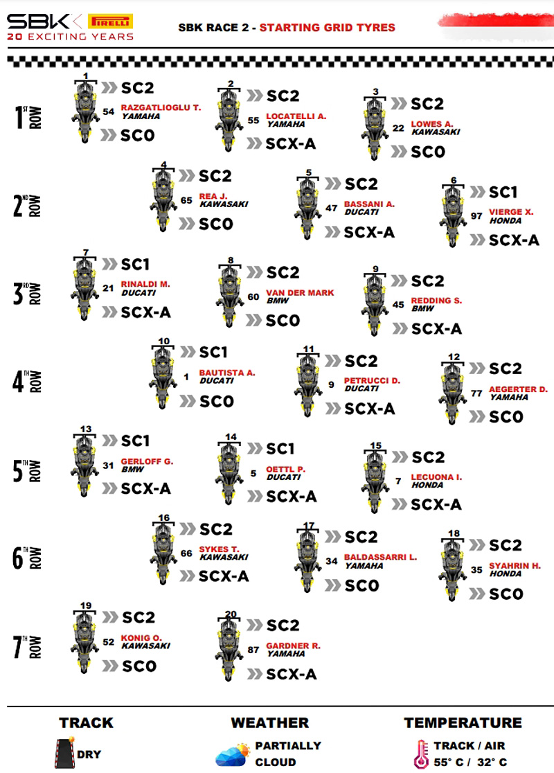 Les choix de pneus des pilotes ont été presque unanimes pour la course 2 étant donné les conditions de piste : tous standards, SC2 avant et SC0 arrière. La seule exception était Andrea Mantovani (Evan Bros. WorldSSP Yamaha Team) qui a préféré utiliser le SCX standard à l’arrière.