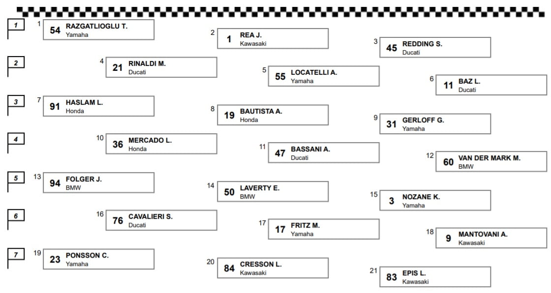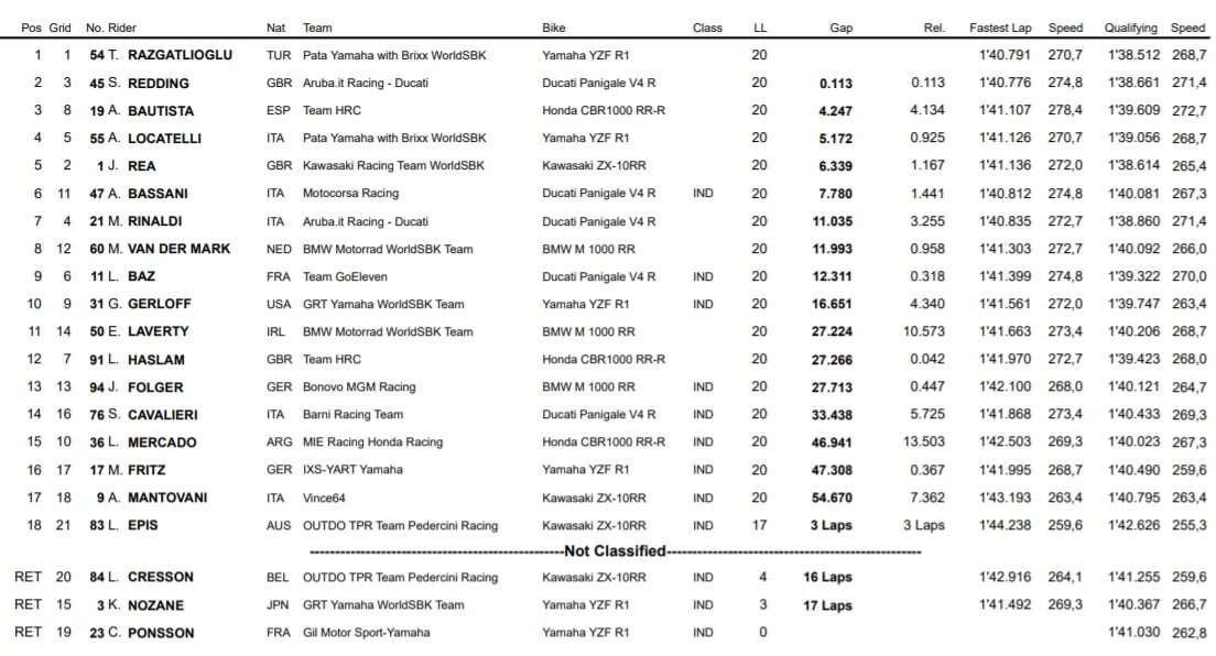 Derrière Rea, on retrouve donc Bassani, qui devance son compatriote Rinaldi et Michael van der Mark. Le top 10 est complété par Loris Baz et Garrett Gerloff, alors que trois abandons sont à signaler, à savoir ceux du Français Christophe Ponsson, du Japonais Kohta Nozane et du Belge Loris Cresson.