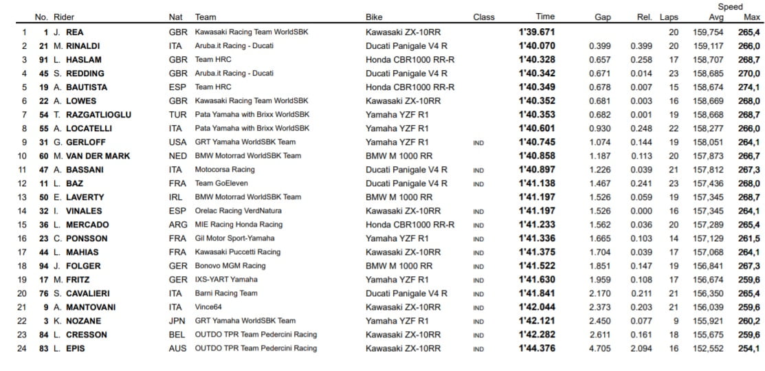 Mais Rea a fait le boulot lors de son dernier tour lancé en toute fin de séance, signant un remarquable 1’39.671. Le pilote Kawasaki est ainsi le seul pilote à avoir réussi à passer sous la barre des 1’40 au cours de ces FP2.