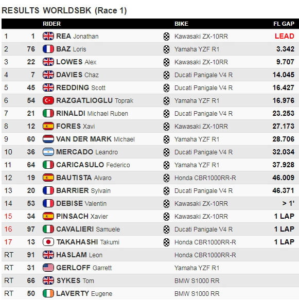 A l’extinction des feux rouges, Tom Sykes réagit le mieux mais Jonathan Rea et Garrett Gerloff effectuent un excellent freinage au premier virage alors que Sykes est tassé par l’Américain et part à la faute en entraînant la deuxième BMW.