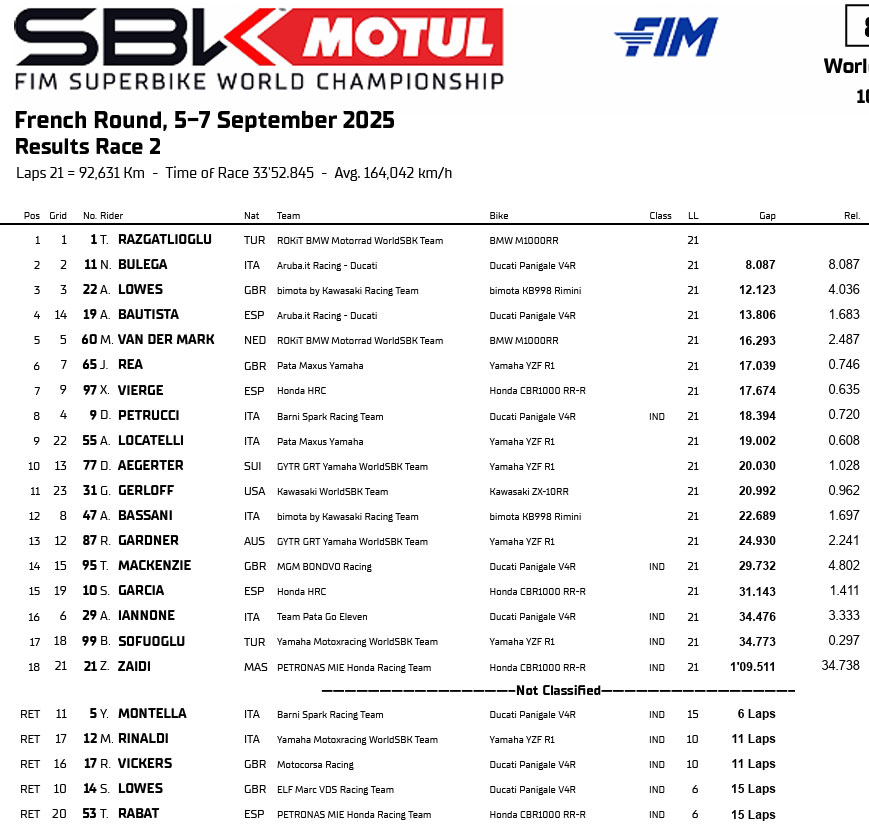 La saison se terminera en octobre, toujours dans la péninsule ibérique, avec un final express en deux semaines : Estoril (Portugal) les 11-12 octobre, puis Jerez (Espagne) les 18-19 octobre. Mais il est très probable que Toprak Razgatlioglu n’ait pas besoin d’attendre aussi longtemps pour sceller son troisième titre mondial, le deuxième consécutif avec BMW.