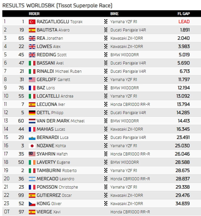 A la fin du premier tour, on retrouve donc les trois cadors Bautista, Rea et Razgatlioğlu en tête, une seconde devant Redding, Lowes, Rinaldi, Bassani, Vierge, Gerloff et Baz.