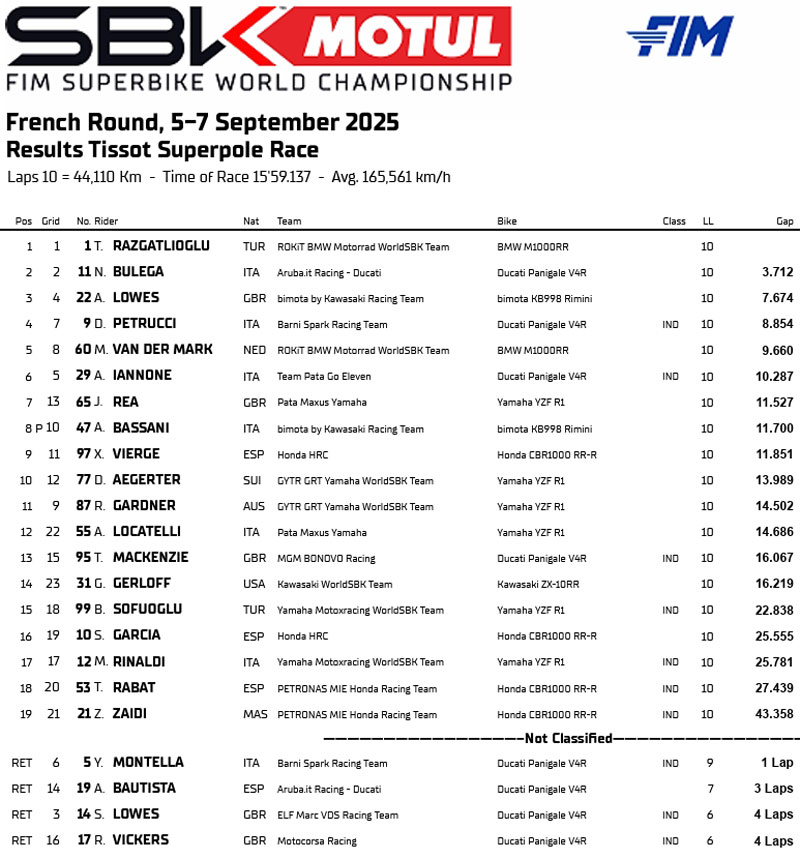 Le phénomène turc Toprak Razgatlioglu s’impose également dans la course Superpole des Superbike à Magny-Cours, et s’échappe désormais vers le titre de champion du monde. Danilo Petrucci termine à nouveau quatrième, tandis qu’Andrea Iannone se classe également sixième.