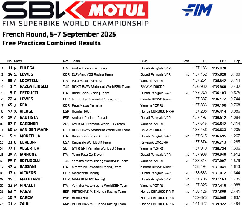 Nicolò Bulega (Aruba.it Racing – Ducati) a signé le meilleur temps de la première journée, avec un chrono plus rapide que le record officiel de la Superpole. Le pilote italien, actuel deuxième du championnat, a voulu montrer sa vitesse et a impressionné particulièrement dans le dernier secteur, où il a été plus rapide de plus de deux dixièmes que tous ses rivaux.