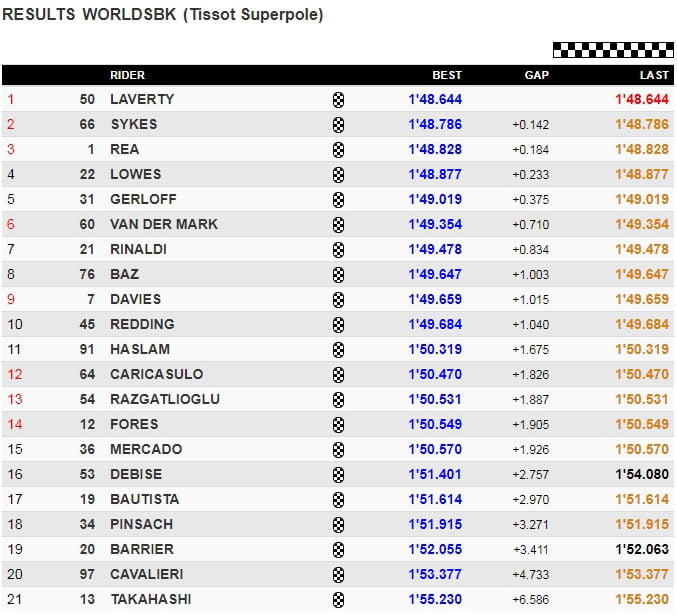 Au final, c’est le pilote BMW Eugene Laverty qui réalise 1’48.644 devant son coéquipier, alors que Jonathan Rea se rate un peu dans sa tentative mais parvient à figurer in extremis sur la première ligne de la grille.