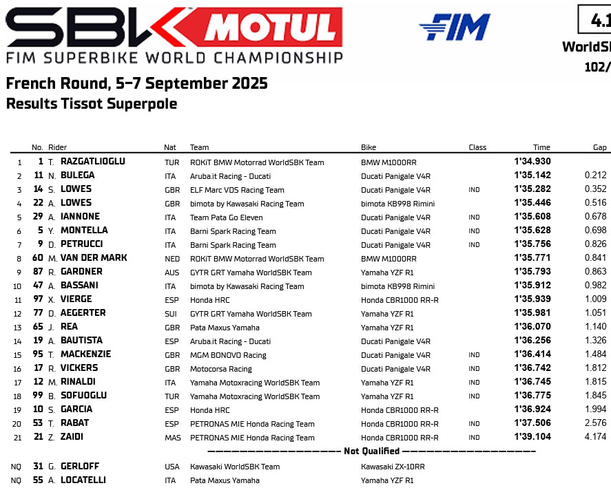 Le Superbike s’apprête à offrir un phénomène au MotoGP. Toprak Razgatlioglu a décroché la Superpole, pulvérisant le record de Magny-Cours : c’est sa première pole position ici, la 23e de sa carrière et la cinquième de cette saison triomphale. Son poursuivant, Nicolò Bulega, a été fort, se rapprochant au plus près du Cannibale : deuxième. L’autre Ducati de Sam Lowes sera également en première ligne pour la Course 1. Andrea Iannone, enfin de retour à la place qui lui revient, a terminé cinquième temps, deuxième ligne. L’ancien pilote MotoGP s’est réveillé, mais reste sans moto pour 2026 : une folie.