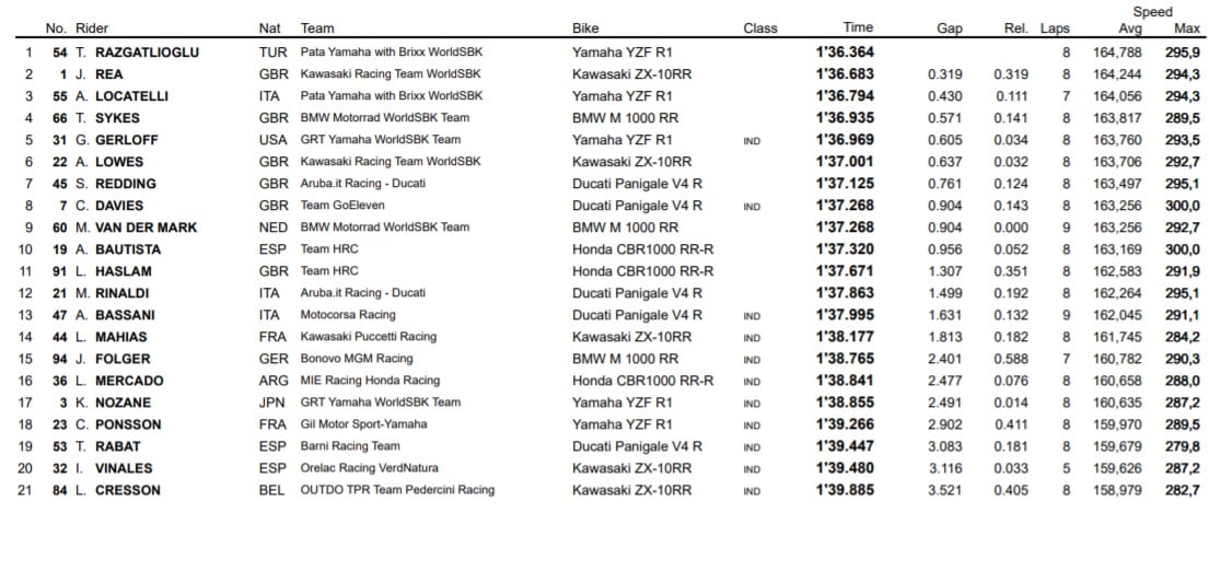| Warm up | 1’47.848 Michael Ruben Rinaldi | 1’36.364 Toprak Razgatlioglu |