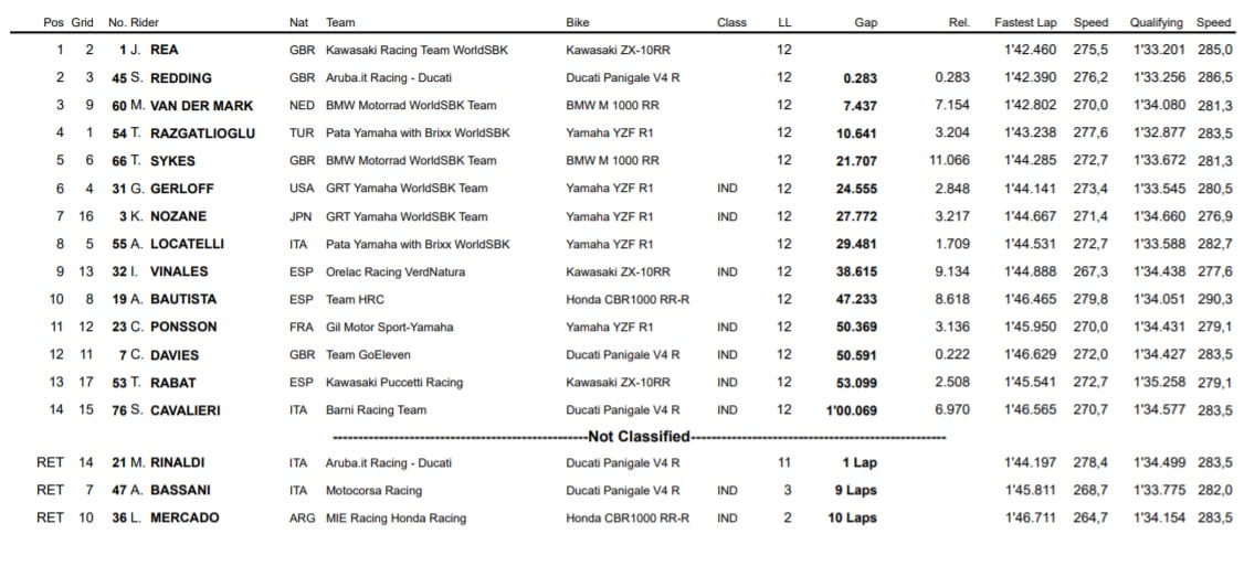 Redding et Van der Mark sur le podium, Razgatlıoğlu termine donc en quatrième position, devant Tom Sykes et Gerloff. On retrouve ensuite Kohta Nozane en septième position, devant le Rookie de l’année, Andrea Locatelli.