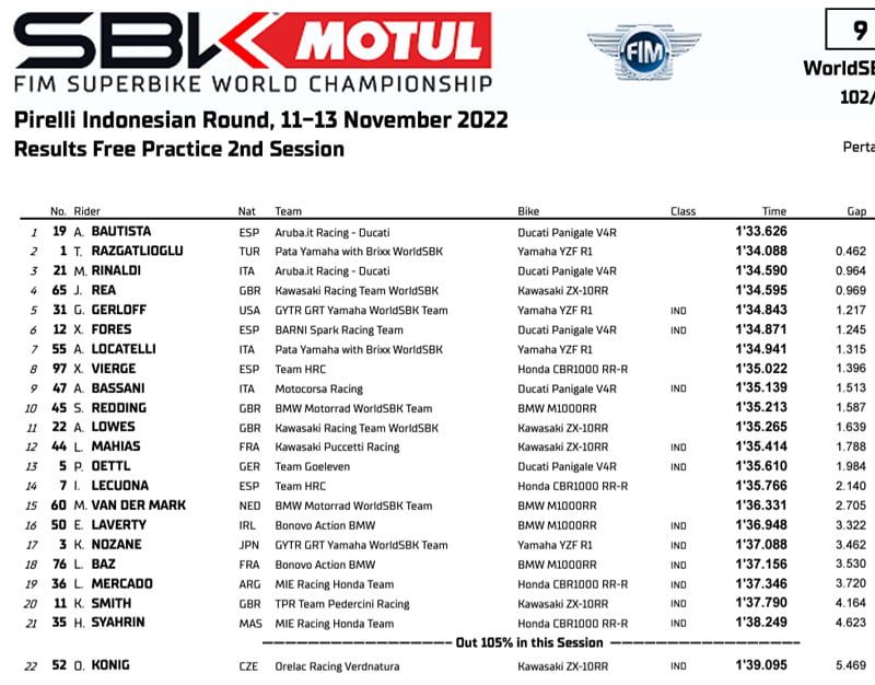 Malgré les conditions très chaudes (36°C dans l’air, 61°C sur la piste !) Alvaro Bautista a réussi à redescendre à 1’33″ 626, soit six dixièmes de moins que le record de course de l’an dernier, signé par Toprak Razgatlioglu. Les Indonésiens avec le resurfaçage ont dû faire un excellent travail, mais c’est un fait que le pilote Ducati fait de plus en plus corps avec sa Panigale. Le Turc a pris près d’une demi-seconde, l’autre Ducati officiel de Michael Rinaldi une seconde pleine. En fin de séance, Jonathan Rea s’est lui aussi retrouvé loin, quatrième, devant Garrett Gerloff, désormais au générique de fin avec Yamaha GRT : l’an prochain, le Texan sera chez BMW Bonovo.
